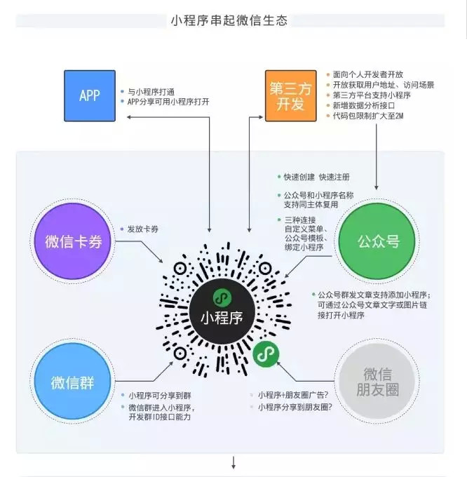 这也是小程序让人充满想象的原因,小程序能够将此前微信所有的生态和积累全部串联起来,比如企业微信,比如朋友圈和搜索。