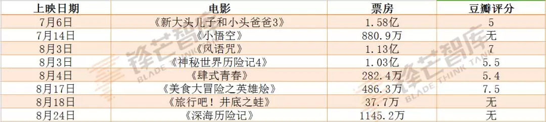 此外,号称有新海诚团队贡献力量的《肆式青春》,迎合了日漫粉的心理,但日漫视觉风格与中国老套故事显得格格不入,累计票房只有282.4万;8月17日公映的《美食大冒险之英雄烩》,以美食做出了拟人化的全新世界,与《疯狂动物城》有异曲同工之妙,虽口碑不俗,但还是因市场失利在21日宣告撤档;而《旅行吧!井底之蛙》等动画,还停留在蹭过气热点的阶段,自然难以为观众接受。
