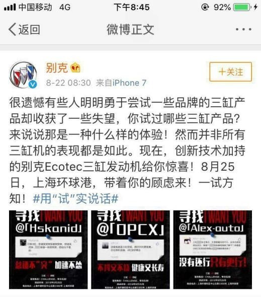 就在小智对这些厂家的“不作为”愤怒的时候,上汽通用竟然在自己的官方微博发声,主动@网友去线下盲测体验三缸机。作为第一个主动站出来去给三缸机正名的车企,别克的勇气可嘉,但会不会被机智的网友打脸呢?带着疑问,小智以媒体的身份也去参加了现场活动。