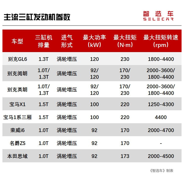 由于少了一套气缸组件之间的摩擦,再加上更好的低转速扭矩,三缸发动机在燃油经济性上的优势十分明显。至于三缸机动力是否够用的问题,小智也搜集了一些目前市场上主流的三缸发动机参数。