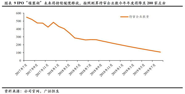 不过,需要注意到的是,当前堰塞湖仅仅是缓解,而非消除,据广证恒生以今年来每月预披露企业均值、每月终止审核企业均值、上月待审企业5%的上会企业数量、50%过审率等指标进行估算后指出,IPO“堰塞湖”将持续缓慢释放,今年年底规模将降至206家左右,2019年8月将进一步降至100家左右。