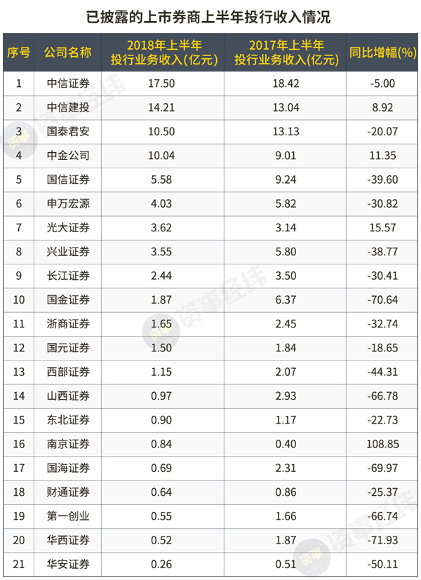 而从截至8月28日披露的19家上市券商的半年报来看,中信建投和中金公司投行收入分别达14.21亿元和10.04亿元,同比保持8.92%和11.35%的正增长。中信证券也实现投行收入17.5亿元,同比小幅下跌5%。很多中小券商投行收入则同比大幅下滑。