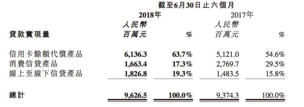 财报显示,2018年上半年,维信金科实现放款规模为96.26亿元,同比仅增加3%。维信金科的信用卡余额代偿产品仍然占贷款总额的63.7%的比例。