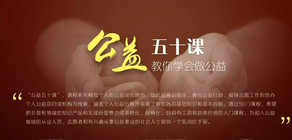 “五十课,教你学会做公益”。由福特基金会资助,中国公益研究院(CPRI)实施的“公益慈善网络公开课”项目面向广大有志于进入公益慈善行业的志愿者、大学生和社会公众,集结国内公益慈善领域以及非营利组织和机构的资深人士,开发50门视频公开课,通过互联网传播。