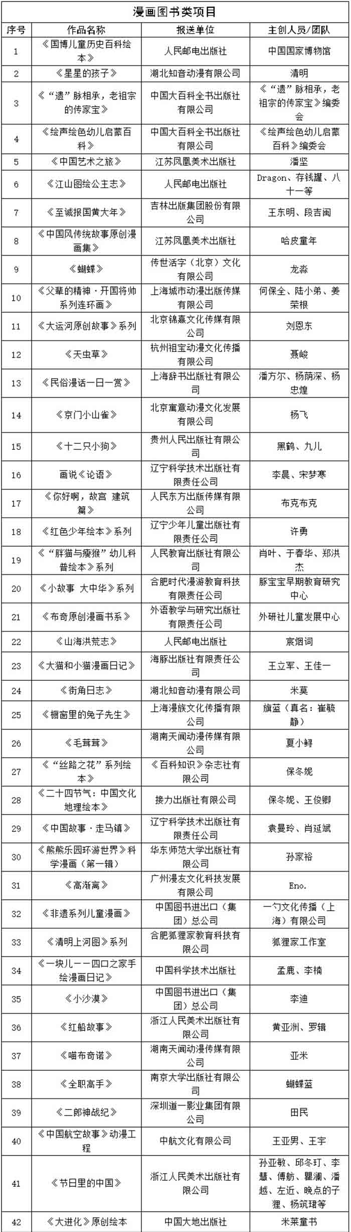 经过项目申报、资料审核、项目评审、专家审读等程序,81个项目入选。其中漫画图书类项目有《全职高手》、《蝴蝶》和《十二只小狗》等42个,网络动画类项目有《口袋森林》、《宇宙护卫队》和《我们的小小洲》等19个,网络漫画类项目有《谁是大英雄》、《时间当铺》和《伏羲客栈》等14个,期刊连载类项目有《她他》等6个。