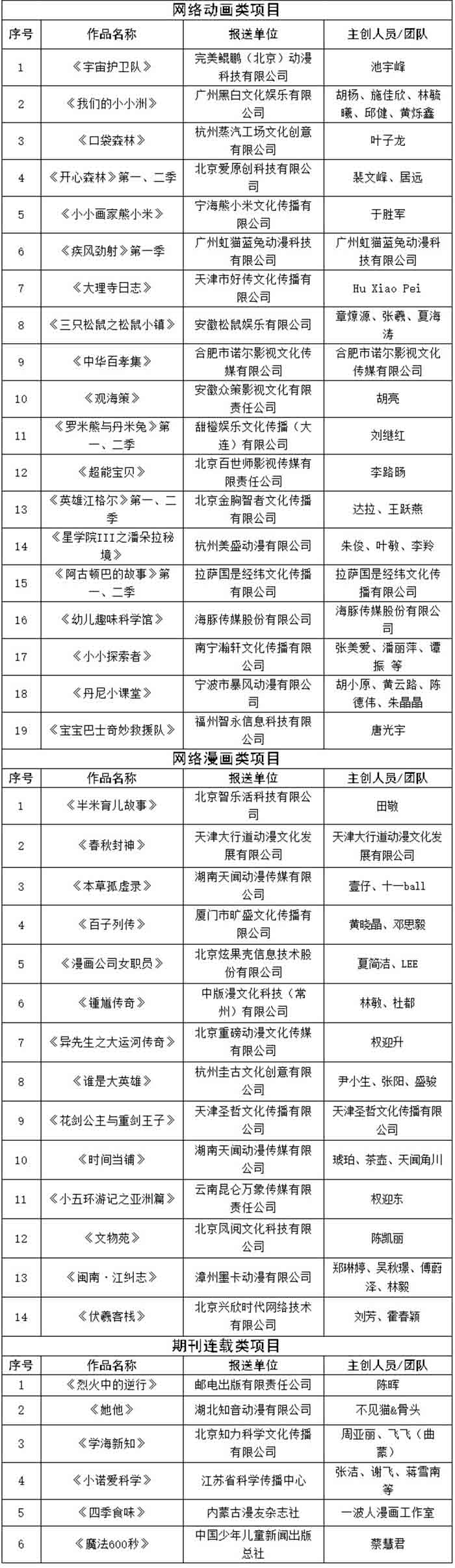 2018年“原动力”中国原创动漫出版扶持计划入选项目公示目录: