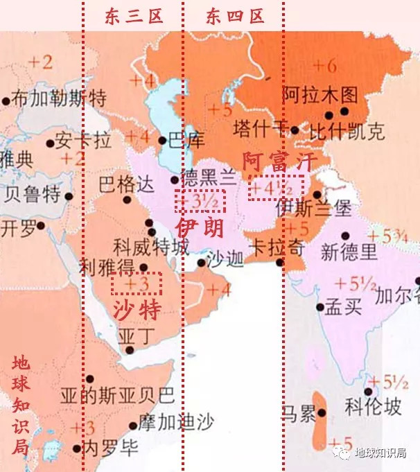 不过当我们把视角放大,看到伊朗周边这些不让它省心的邻居,答案似乎就呼之欲出了。伊朗在中东最讨厌的几个逊尼派对手,土耳其、伊拉克、沙特,全部都是东三区的。和邻居们不共戴天的伊朗,当然希望从一切可能的角度与他们划清界限,在时区上如果可能话,也要尽可能制造一些阻隔。