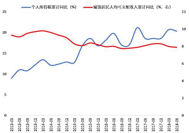 另一个是个人所得税,直接反映了工资、薪金所得情况,今年前7个月累计增速为20.6%,比2017年全年增速还高了2个百分点。这可能跟纳税群体扩大以及个税征收体系日趋完善后逃税减少有关,并不能说明个人所得也有这么大的提高,但至少能侧面反映居民收入增速还不错。