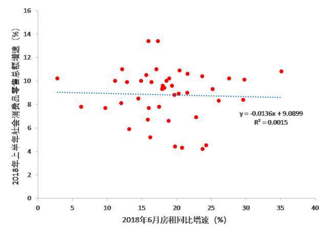 但房租上涨,对消费的整体影响有限。考虑到数据的可得性,我们统计了44个城市的今年6月房租同比增速、上半年社会消费品零售总额增速。发现房租上涨对消费只有微弱的影响,在统计学层面上看这种影响可以忽略不计。