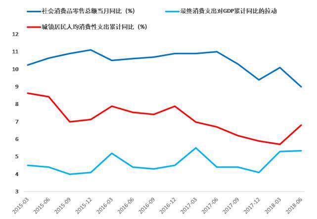 由于GDP口径最终消费支出同比只有年度数据,我们不能直接观察到今年上半年最终消费支出的增速。但今年一、二季度最终消费支出对GDP同比的拉动分别为5.3%和5.4%,比2017年后面三个季度高了不少,侧面反映了消费,尤其是服务消费很强劲。