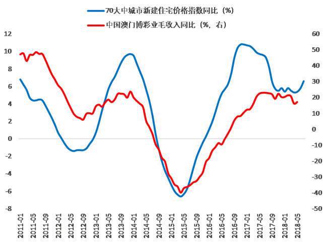 房价上涨,利好高端消费,很容易理解。无论是没有实际交易时的财富效应,还是真正有买卖时的财富再分配,社会财富都在向富裕人群聚集,带动奢侈品消费。我们看到,澳门博彩业毛收入同比增速,与70大中城市新建住宅价格指数同比,有很强的同步性。