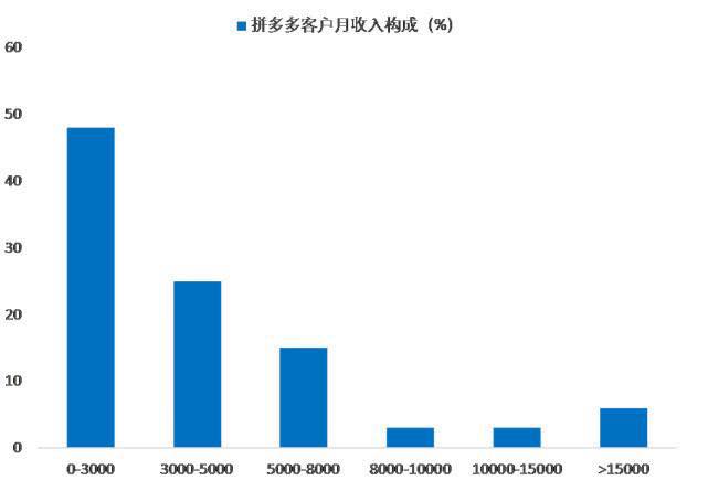 用户数据也显示拼多多更集中在中小城市和乡村的低收入群体。据统计,拼多多在一线、二线、三线、四线及以下城市的客户占比分别为7%、28%、23%和42%,而京东的这一指标分别为16%、34%、20%和30%,对比来看拼多多市场下沉明显。收入分布上也是如此,48%的客户月收入低于3000元,25%的在3000-5000元之间,超过1万的只有9%。