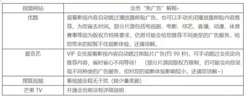 同样的问题在优酷、爱奇艺、搜狐视频、芒果TV等视频网站也存在,但只有优酷和爱奇艺在“去广告”下给出了详细解释。