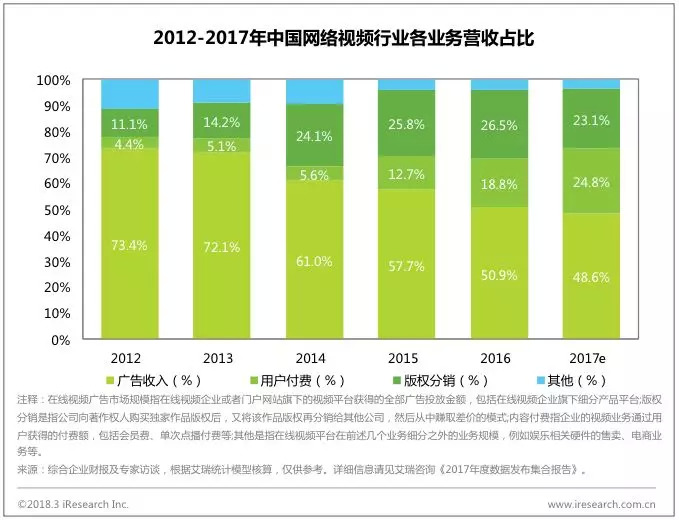 从下面的图表能看出,2017年视频网站的付费收入也仅占24.8%。广告收入占比虽在逐年下降,但仍然有一半的比重。