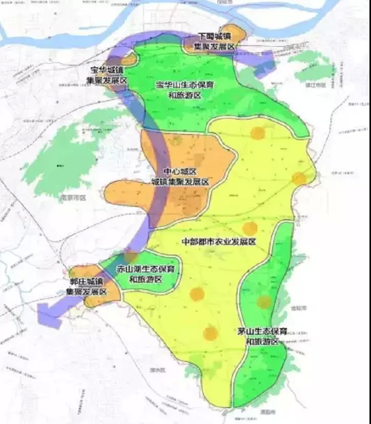 “八片”——中心城区和宝华镇、下蜀镇和郭庄镇共四个城镇集聚发展区,宝华山、茅山、赤山湖三个旅游区,白兔、春城“茅山”、边城、后白、天王镇构成的中部都市农业发展区。