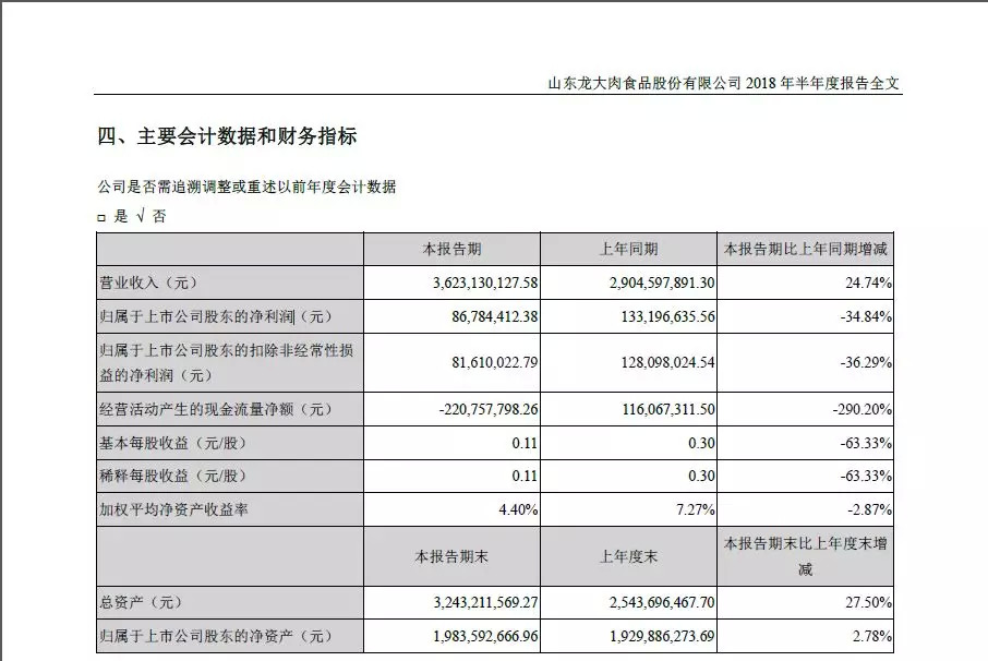 对此,龙大肉食方面表示,受行业周期性变化影响,2018年3-6月的公司生猪销售价格低于原先预计的水平,导致公司养殖业务出现亏损,进而影响公司整体盈利能力。