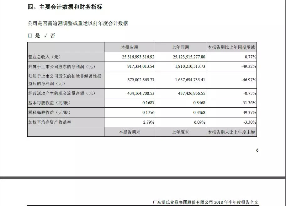2018年上半年,温氏股份实现营业收入约为253.17亿元,同比增长0.77%,几乎陷入停滞状态;