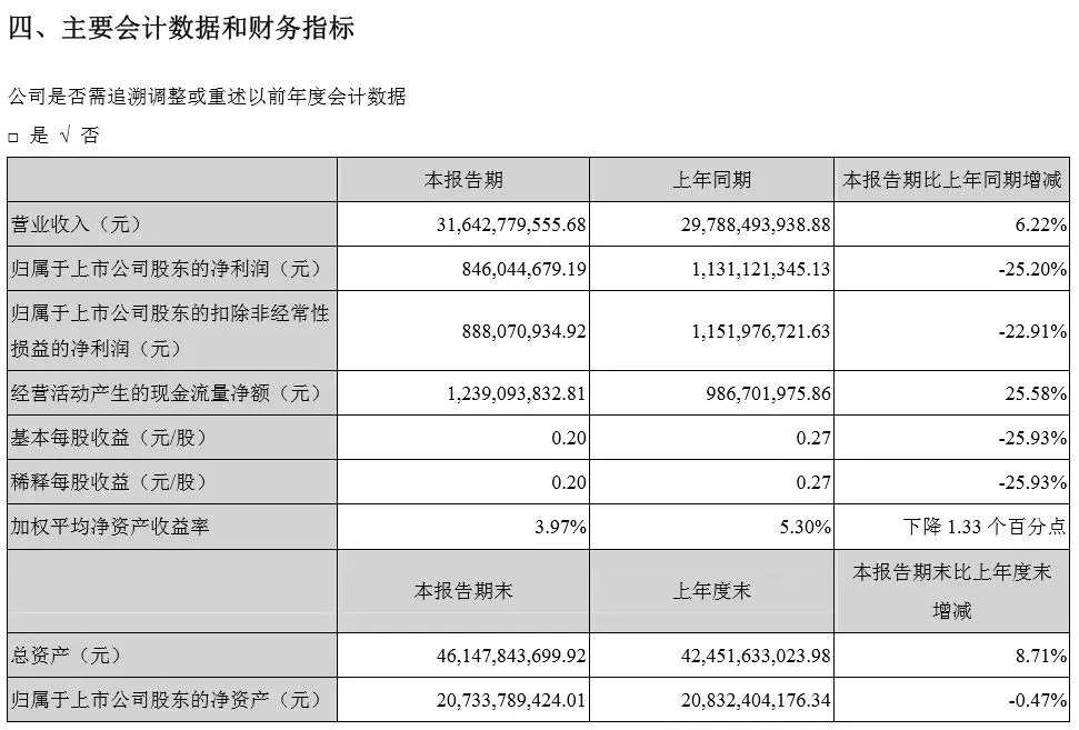 归属于上市公司股东的净利润约为9.17亿元,和去年同期约为16.58亿元相比,降幅在49%以上,几乎就是腰斩的节奏。