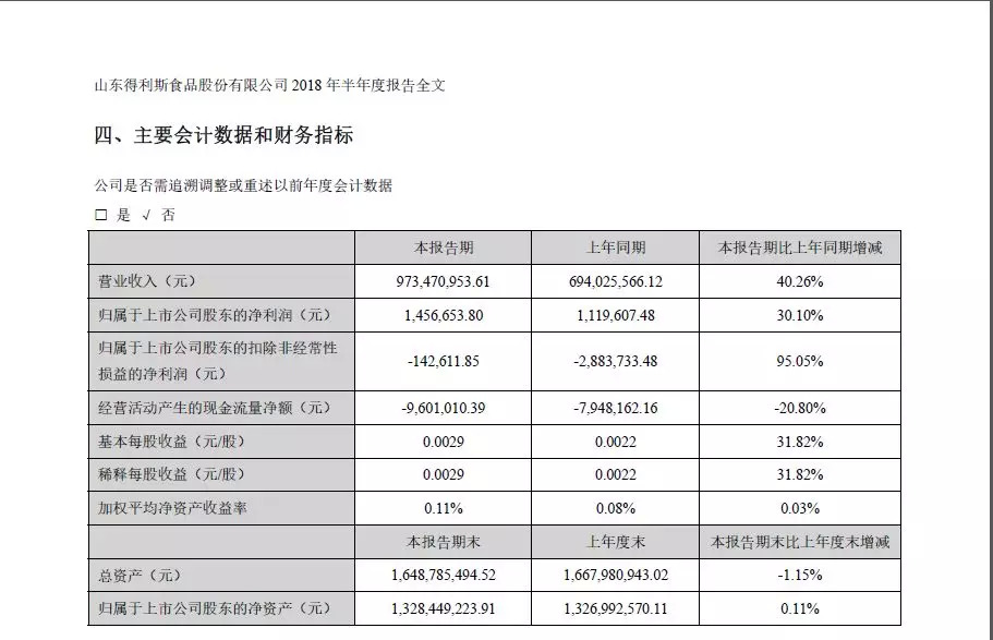 另外,2018年上半年,得利斯实现营业收入在9.7亿元左右,同比增幅超过40%;但归属于上市公司股东的净利润不到146万元,同比增幅在30%以上。
