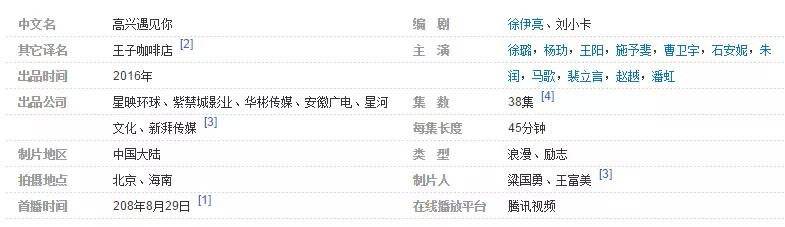1.导演在百科上没有署名:该剧由《继承者们》的导演姜信孝联手名导金亨植执导,中韩顶级制作团队联手打造。但在百科的介绍上,既没有表明是改编自韩国小说《咖啡王子1号店》,更没将导演的名字放入简介中。