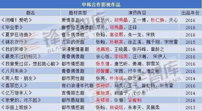 笔者根据网上资料显示,统计出13部“中韩合作影视作品”。其中有9部作品的出品时间都是在2016年,而“限韩令”也正是在那年9月开始实施的。在当时限令一经发布,便令不少韩星在内地的活动被叫停,就连一众韩星参演的内地剧也纷纷下架无法上线播出。