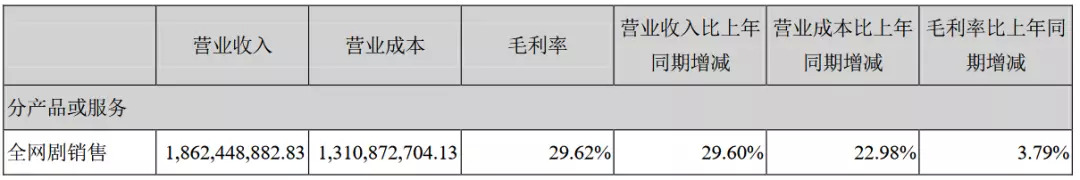 全网剧销售的营业收入达18.62亿,占据总营收的85%,较去年有所提升。