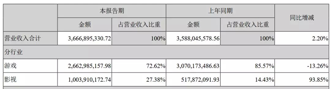 从半年报中可以看出,2018年上半年,完美世界影视版块的收入约为10.04亿元,同比增长率高达93.85%。而它上半年的总营收为36.7亿元,比去年同期增长2.2%,但游戏板块的收入同比去年反而下降了13.26%。