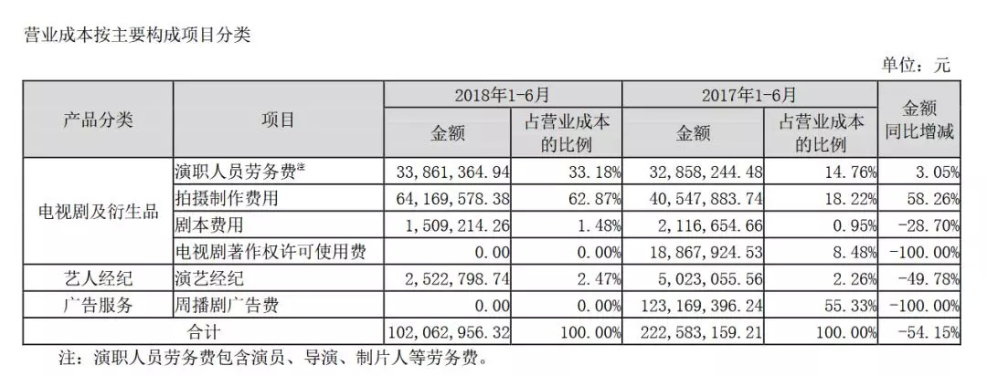 同时,在欢瑞世界2018上半年的经营成本中,演职人员劳务费和拍摄制作费用的比例有明显提升,艺人经纪板块中演艺经纪的比例则有较大幅度的下滑。
