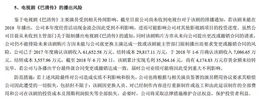在报告的开端,除了影视公司常规的风险提示,唐德影视加上了一条,“电视剧《巴清传》的播出风险”。