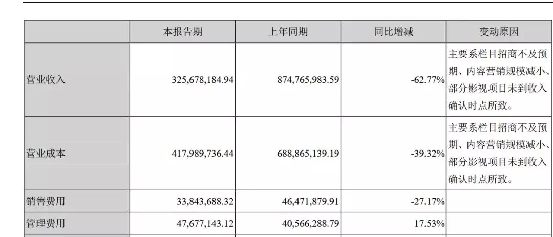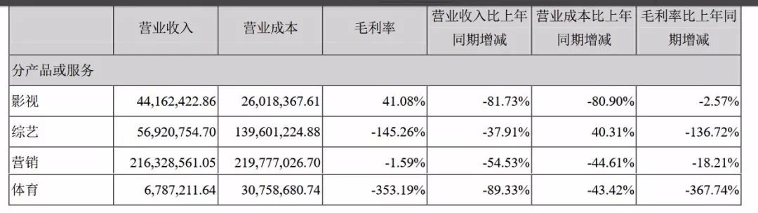 业绩遭遇大幅度下降,主要源自综艺板块和体育板块。