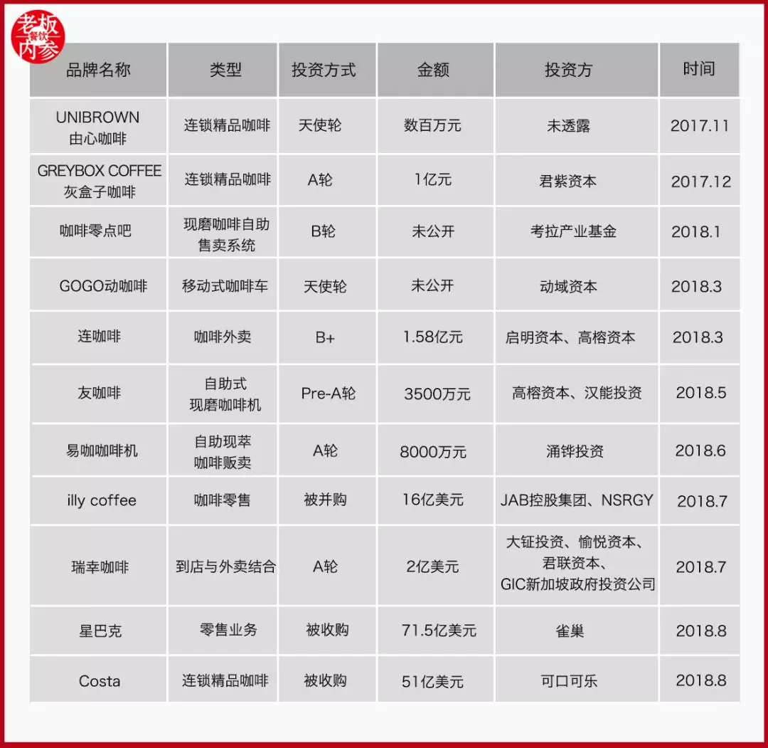据内参君不完全统计,从去年下半年到现在,屡有咖啡品牌融资、并购的消息爆出,其中便有今年攻城略地十分抢眼的瑞幸。有人戏谑地称,2018年“瑞幸(luckin)烧了10亿人民币,烧掉了星巴克100亿美金市值”。