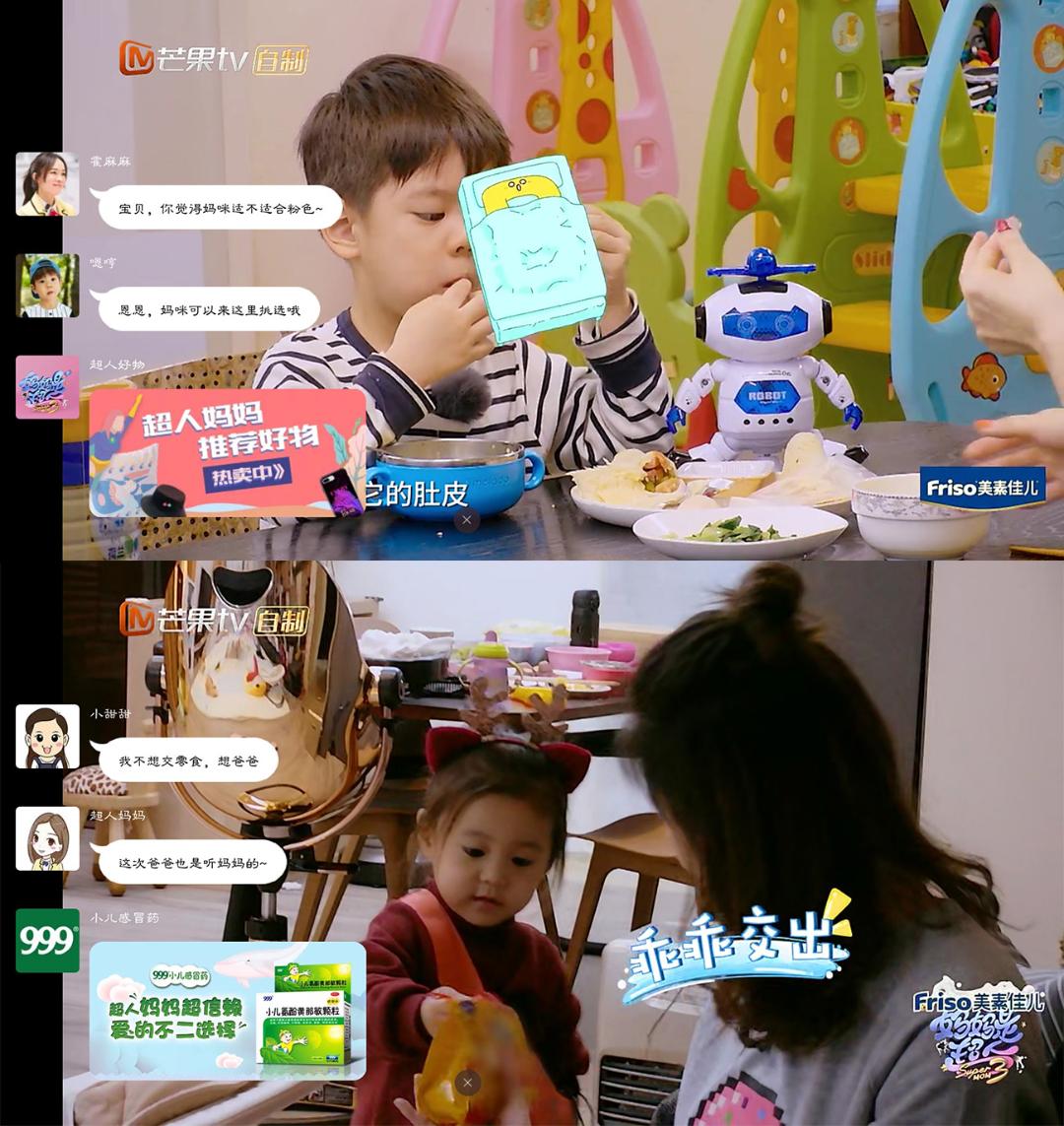 综艺里就要靠强大的后期了。比如在《妈妈是超人》里,霍思燕涂水乳时就显示了“OLAY小哑铃 精华渗透快又行”字样,接着又对产品进行了特写,随后又加上滤镜和画框直播了整个化妆过程,为景晰美妆Live打了个广告,一个场景植入了两大金主,却因情景化设定让人没那么反感。此外利用温馨的对话框形式植入品牌小贴士,也颇具创意。(在合适的时候来撩你,给后期加鸡腿!)