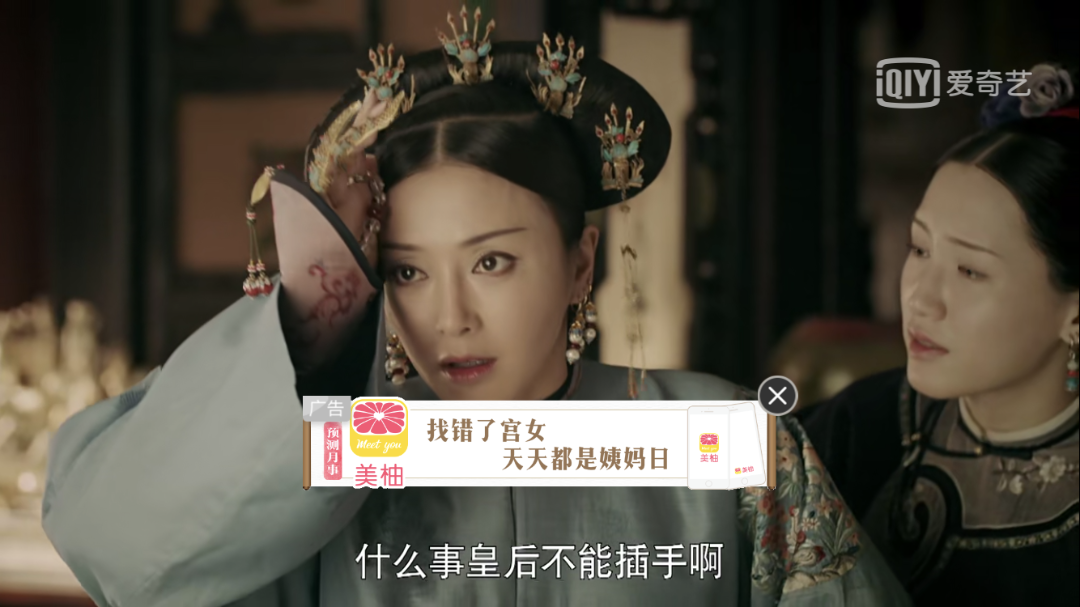 电视剧里的创意场景贴近来也是火爆异常,比如《延禧攻略》里,尔晴怀孕傅恒被绿,雍禾植发的广告就弹出来了,“绿是一道光,脱发莫要慌”,配合剧情打趣植入,瞬间让人喷饭。“新的广告形式?看起来不错”,网友会心一笑,这样的逗比广告倒是比弹幕还有趣呢。类似这样的场景贴还有很多,比如美柚、999皮炎平等等。