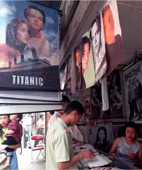 昆明街头贩卖《泰坦尼克》主题海报、贴纸、相片。(图片来自网络)