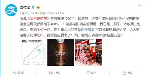 《我不是药神》的宣发,阿里影业覆盖了手淘、支付宝、淘票票、优酷等30家app,达到了近4亿的宣传资源曝光。