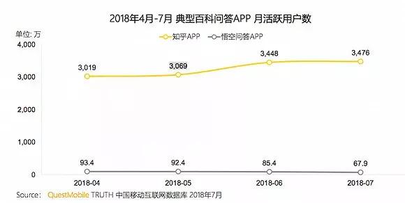 战略放弃悟空问答,对今日头条这样一家习惯了成功的企业来说,并不是很多见。根据QuestMobile的数据,2018年4月到7月,悟空问答平均在80万左右,但从6月到7月,悟空问答的活跃用户活跃用户陡然下降17万,而这和知乎的月平均活跃用户保持在3200万左右形成了鲜明对比。