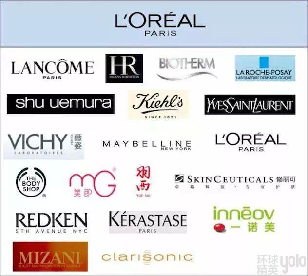 欧莱雅集团旗下有HR赫莲娜、兰蔻、碧欧泉、巴黎欧莱雅、乔治·阿玛尼(香水、彩妆系列)、圣罗兰(香水、彩妆系列)、科颜氏、植村秀、拉夫劳伦(香水系列)、科莱丽、迪塞尔、羽西、美宝莲纽约等500多个品牌,涉及五大专业领域:护发、染发、护肤、彩妆及香水,绝对是全球化妆品行业的领袖。