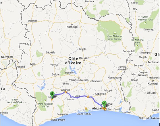 从谷歌地图上看,从东南的阿比让到西部的苏布雷大约是400公里的路程,出差之前有经验的同事就和我们说这一路的路况极差,单程过去都要六七个小时,不过我们三还是打算赶个大早尽量当天来回,后来才发现是绝无可能。