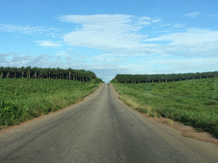 我们的车子一出了阿比让路上就几乎见不到其他车辆了,前几个小时路上的路况并不糟糕,因为据说这条高速半年前才修好。路两边基本上都成片成片地种满了各种经济作物,最常见的是橡胶树和棕榈树。科特迪瓦至今是一个农业国,根据维基百科这里盛产可可咖啡稻米小米香蕉凤梨花生棉花椰子棕榈油橡胶玉蜀黍甘蔗甜薯和树薯等,其中可可年产量居世界第一。其实呢这些农产品产的再多卖的再多,最后的价值可能还比不上邻居加纳随便一个小金矿。