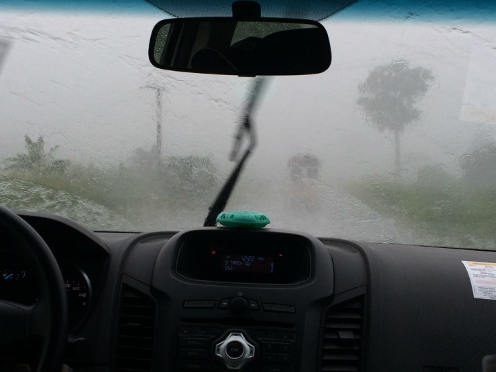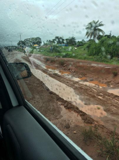 离开阿比让越远路况就越差,基本上就是一段黄土地一段坑坑洼洼的泥地,第二天我们回程的时候下了暴雨,路况就基本变成这幅德性了: