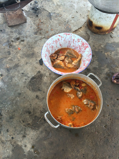 主食可以选,有两种鱼,要么是上面这种要么是下面这种。我选了上面那种,怎么说呢,汤的味道非常非洲,鱼的味道也非常非洲。我们说要杯可乐吧,没有可乐只有从地上水管里接出来的自来水,最后我们都喝了,我觉得吧至少不会比这鱼汤还不健康。