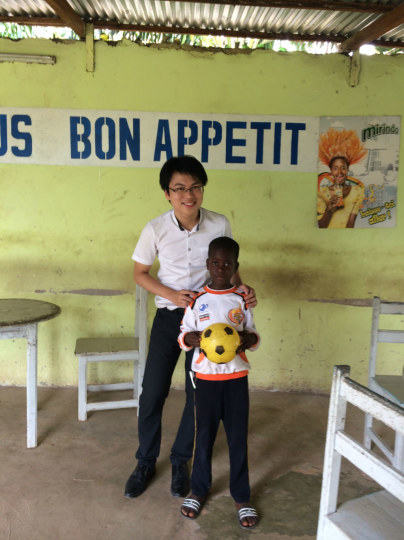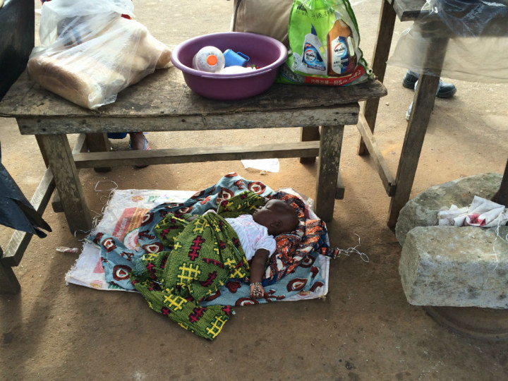 上图是集市上熟睡的孩子。下图是我们在陪一个小朋友玩球。这位小朋友今年七岁,没有钱上学读书。学费一年500块人民币。我们在车上刚好有点小蛋糕就送了他,小朋友的爷爷妈妈就从远处跑来不停地向我们道谢。