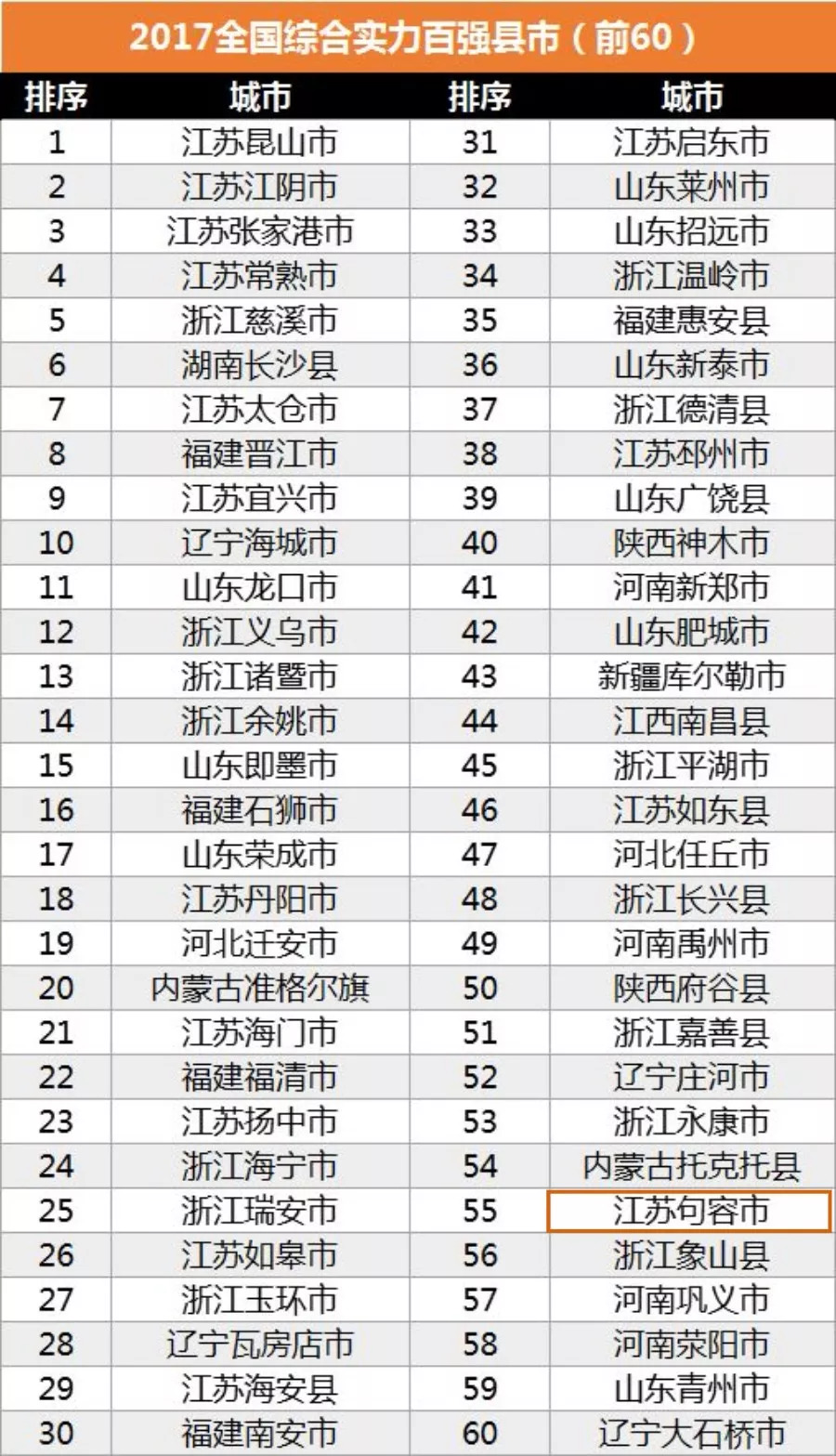 2017年,句容市位于全国百强县综合排名第55位,常住人口63万、居民可支配收入4.4万元。