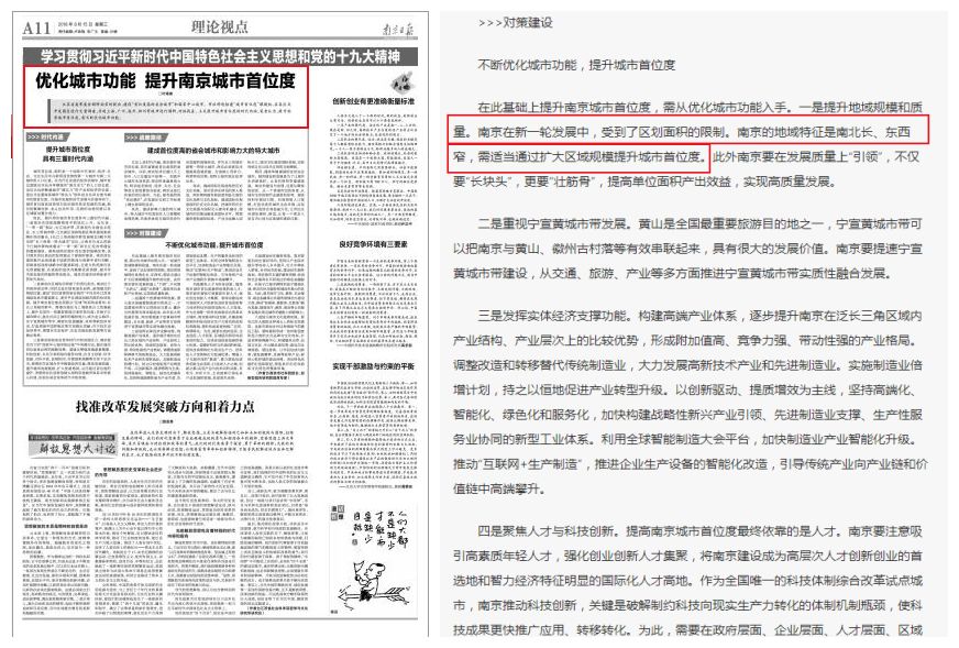 8月15日,南京日报A11版刊载叶南客文章《优化城市功能 提升南京城市首位度》,其中提到,“提升南京城市首位度,需从优化城市功能入手。一是提升地域规模和质量。南京在新一轮发展中,受到了区划面积的限制。南京的地域特征是南北长、东西窄,需适当通过扩大区域规模提升城市首位度。”