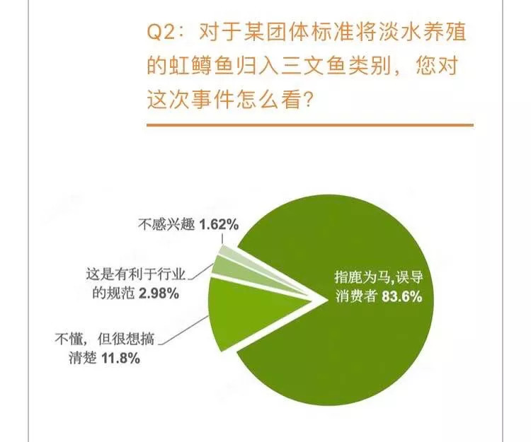 上海消保委调查显示,83.6%的消费者认为将淡水养殖虹鳟鱼归入三文鱼类别,是“指鹿为马,误导消费者”。