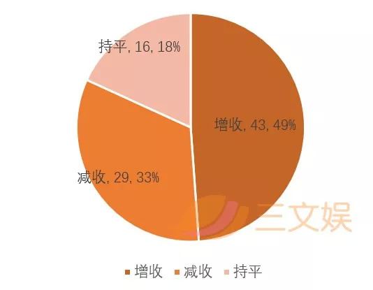 收入增减方面,88家动画制作公司实现收入增长的有43家,占48.8%。而收入减少的公司有29家,占32.9%。持平的16家,占18.1%。收入增加的企业的占比较去年增长了4.5个百分点。