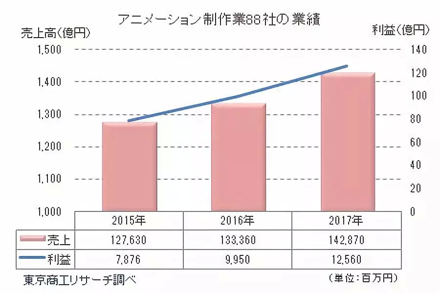 日本“东京商工研究”对“动画制作产业类别”(以日本总务省“日本标准产业分类”为基准的“TSR业种代码”)中88家2017年(2017年1月期-2017年12月期)公布决算信息的公司进行了调查,结果显示,这88家公司2017年的销售额合计1428.7亿日元,比去年增长7.1%。自2015年连续两年保持上升。