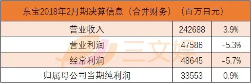 东宝上一财年(2017年3月1日-2018年2月28日)营业收入达2426.68亿日元,同比增长3.9%。当期纯利润335.53亿日元,同比增长0.9%。
