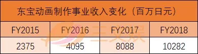值得注意的是,在2018财年中,东宝的动画制作事业收入达到102.82亿日元,比去年增长27.1%,首次突破了100亿日元大关。