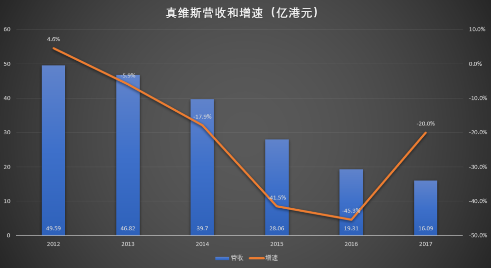 据真维斯公告,截至2018年5月31日前5个月、2017年、2016年,真维斯中国内地业务分别录得税后利润-0.46亿港元、-0.45亿港元和0.67亿港元。